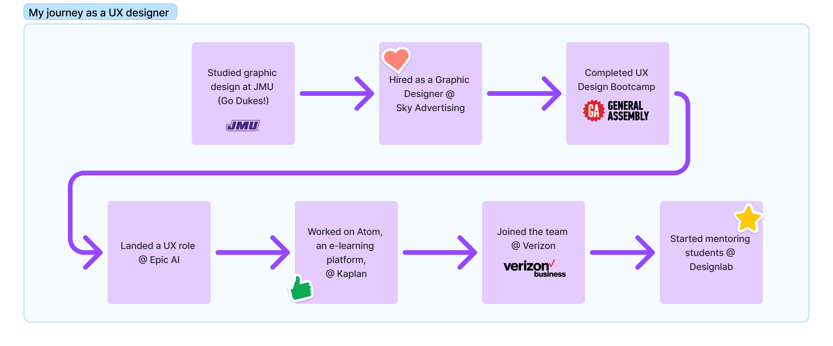 Currently at Verizon, I play a pivotal role in enhancing the e-commerce journey for our business clientele. My journey began as a graphic designer, equipping me with a solid foundation in visual design that seamlessly integrates with my ability to conceptualize and execute end-to-end user experiences.